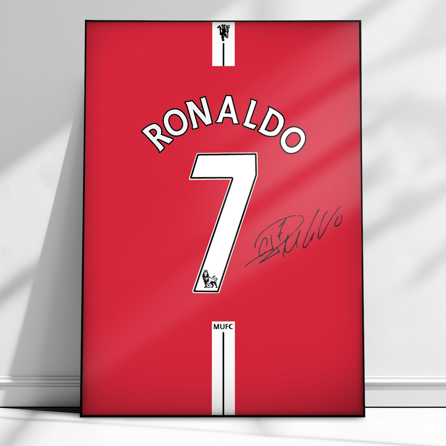 Plakat A3( 42x29,7cm) w czarnej ramce z NADRUKOWANYM autografem Cristiano Ronaldo nr 7 w koszulce Manchesteru United – elegancki dodatek dla fanów piłki nożnej. Stylowa grafika w czarno-zielonych barwach przedstawia numer zawodnika, jego nazwisko oraz autograf. Wysokiej jakości wydruk idealnie nadaje się na ścianę w pokoju kibica lub biurze. Idealny na prezent!