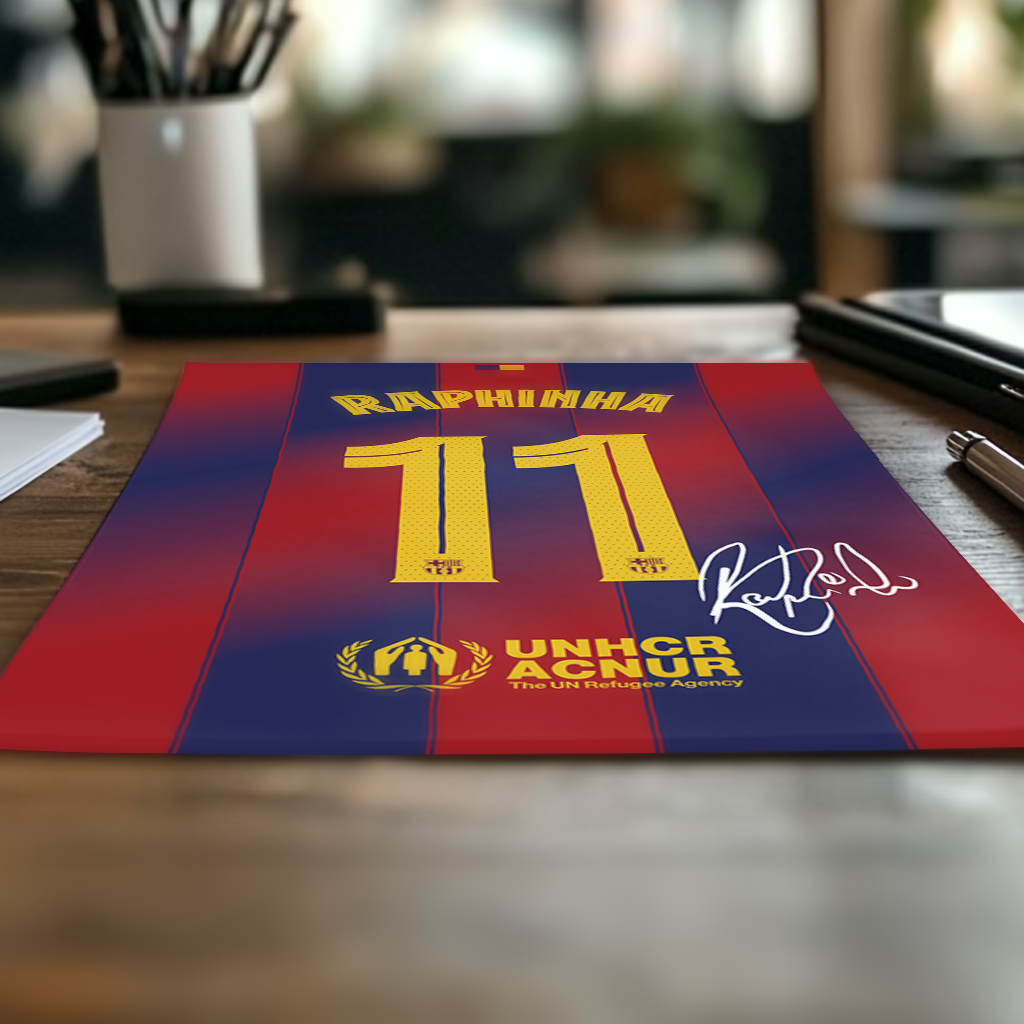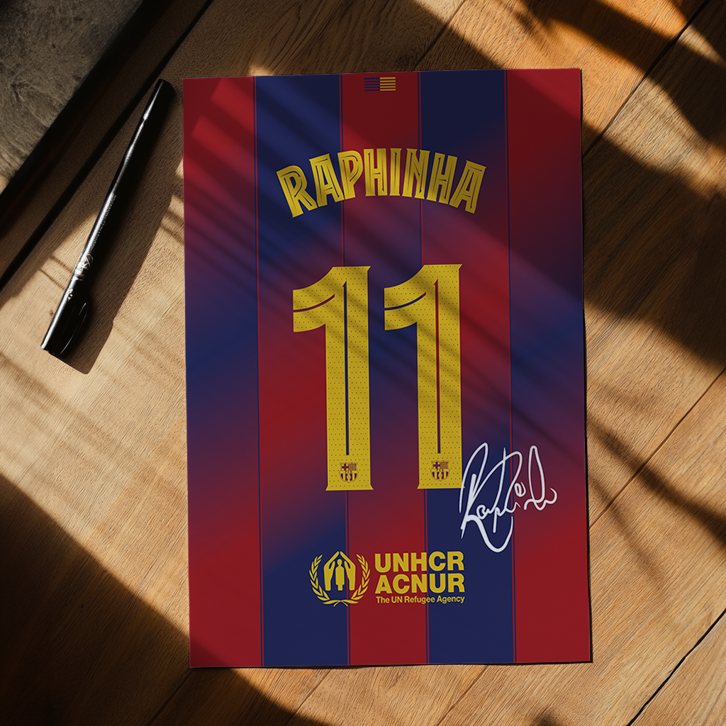 Plakat A3 (42x29,7cm) z NADRUKOWANYM autografem Raphini nr 11 w domowej koszulce FC Barcelony sezon 2025/26 – elegancki dodatek dla fanów piłki nożnej. Plakat wykonany z dbałością o detale, drukowany na wytrzymałym sztywnym papierze 300g odpornym na drobne zagniecenia. Idealny pomysł na prezent na urodziny, święta czy dzień dziecka. Idealny prezent zarówno dla młodego fana, jak i wieloletniego kibica.